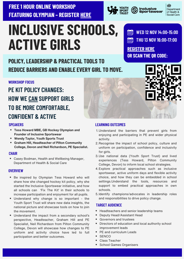 Join our FREE online one-hour workshop for school leaders to explore how policy, uniform and culture can transform participation.